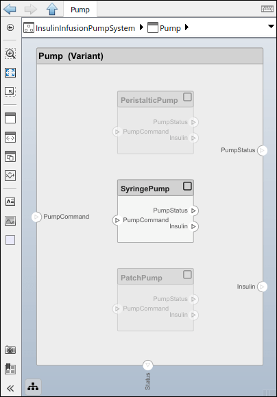 The Variant Component block named Pump contains three different pumps in this example called PeristalticPump, SyringePump, and PatchPump.