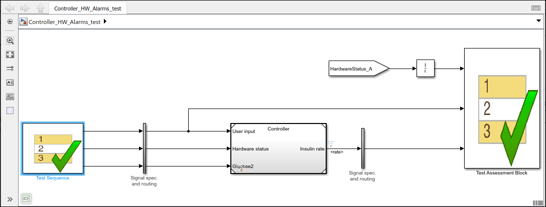 Click the icon.png icon to the right of the Harness box to open the test harness. In this example, the block named Controller is isolated for unit testing using a test harness. For more information on creating a test harness, see Create or Import Test Harnesses and Select Properties (Simulink Test).