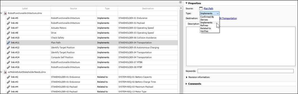 You can set a specific link type. To change link types, in the Requirements Editor (Requirements Toolbox), select Show Links. For more information, see Create and Store Links (Requirements Toolbox).
