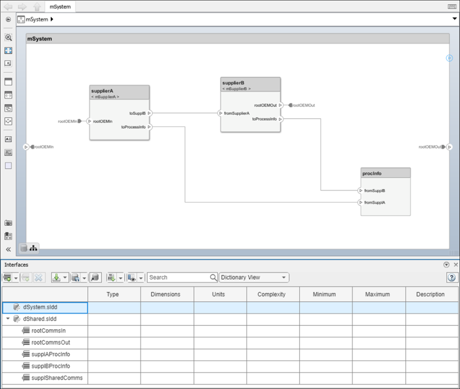 The following diagrams show the system integration model mSystem, along with the Interface Editor. Interface definitions contained in the referenced data dictionary dShared are associated with the ports used to communicate between the models mSupplierA and mSupplierB and the rest of the system integration model.