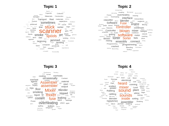 Visualize the first four topics using word clouds.