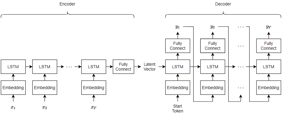 The encoder maps sequences of word indices to a latent vector by converting the input to sequences of word vectors using an embedding, inputting the word vector sequences into an LSTM operation, and applying a fully connected operation to the last time step of the LSTM output. The decoder reconstructs the input using an LSTM initialized the encoder output. For each time step, the decoder predicts the next time step and uses the output for the next time-step predictions. Both the encoder and the decoder use the same embedding.