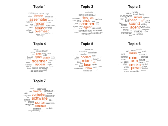Load the LDA model factoryReportsLDAModel which is trained using a data set of factory reports detailing different failure events. For an example showing how to fit an LDA model to a collection of text data, see Analyze Text Data Using Topic Models.
