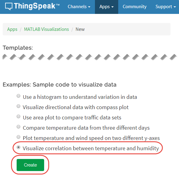 Go to the Apps tab and select MATLAB Visualizations. Click New, select Visualize correlation between temperature and humidity, and click Create.