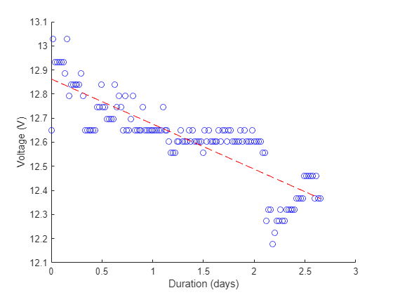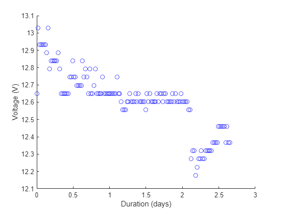 myVoltage = 14.6324 * batteryData.Voltage; battTimes = batteryData.Timestamps; battTimes = days(battTimes-battTimes(1)); scatter(battTimes,myVoltage,'b'); xlabel('Duration (days)'); ylabel('Voltage (V)'); hold on