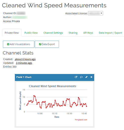 4) Execute your code by clicking Save and Run. The chart in your ThingSpeak channel is populated with time series data for wind speed without the calculated outliers. You can access your channel by clicking the channel link in the Channel Info panel on the right side of the page.