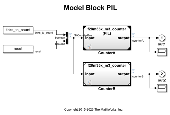 3. Configure and run CounterA Model block in PIL simulation mode by following Example 2 of the Test Generated Code with SIL and PIL Simulations (Embedded Coder).