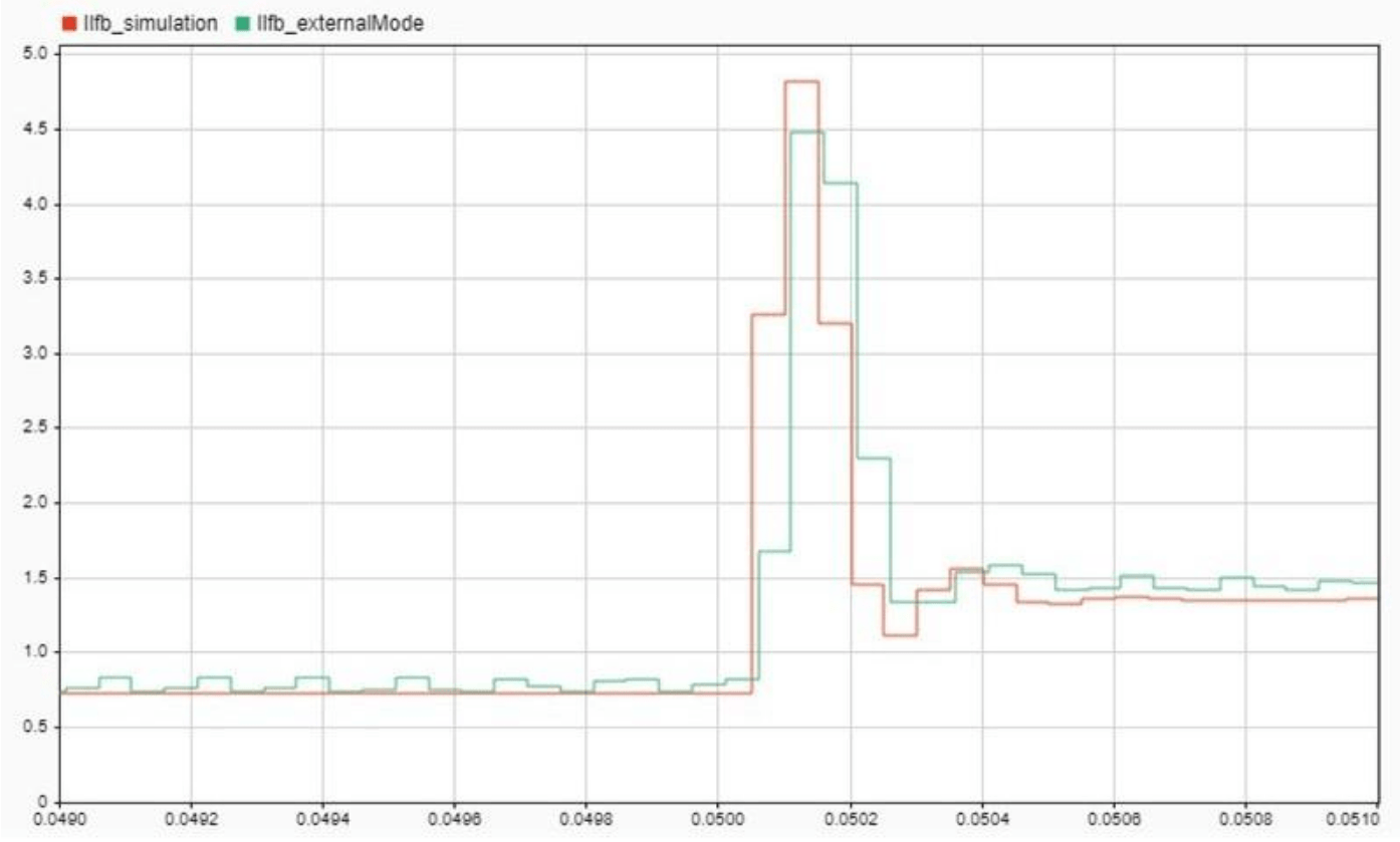 The following graph shows the step response from 0 to 2 volts. The voltage mode controller correctly tracks the desired reference voltage. The currents are below the threshold and the algorithm continues without interruption. It is also observed that the external mode results track the same output obtained in simulation mode.
