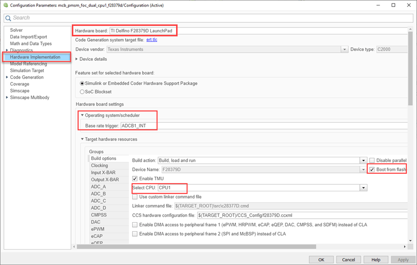 2. To run the model on other TI C2000™ processors, first press Ctrl+E to open the Configuration Parameters dialog box. Then, select the required hardware board by navigating to Hardware Implementation > Hardware board.