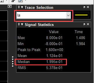 • Under Trace Selection, select a signal (${I_a}$ or ${I_b}$). The characteristics of the selected signal are displayed in the Signal Statistics pane. You can see the median value of the selected signal in the Median field.
