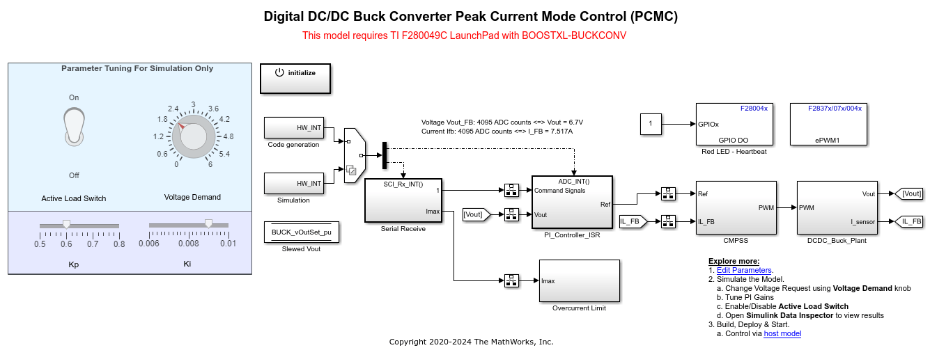 1. Open the f280049C_DCDC_Buck_PCMC model. This model is configured for TI Piccolo F280049C LaunchPad hardware.