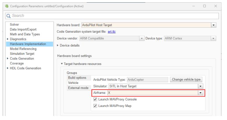 3. In the Configuration Parameters dialog (configset), set the Airframe to X to match the SITL plant.