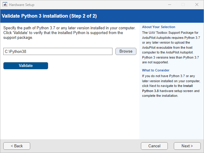 After you provide the path where Python 3.7 or later is installed. Click Validate. Upon successful validation, you can move to subsequent hardware setup screens.