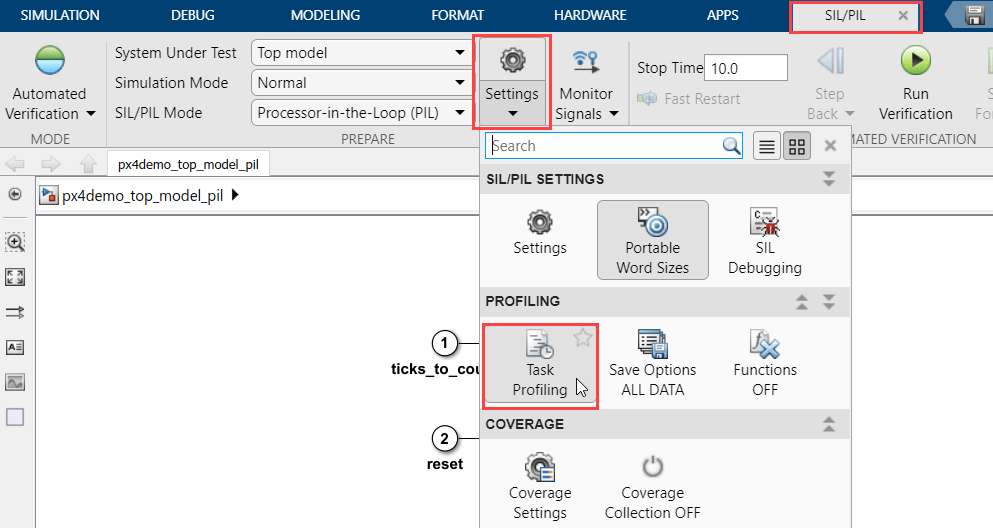 4. Select Processor-in-the-Loop(PIL) from the SIL/PIL Mode drop-down and click Run Verification.