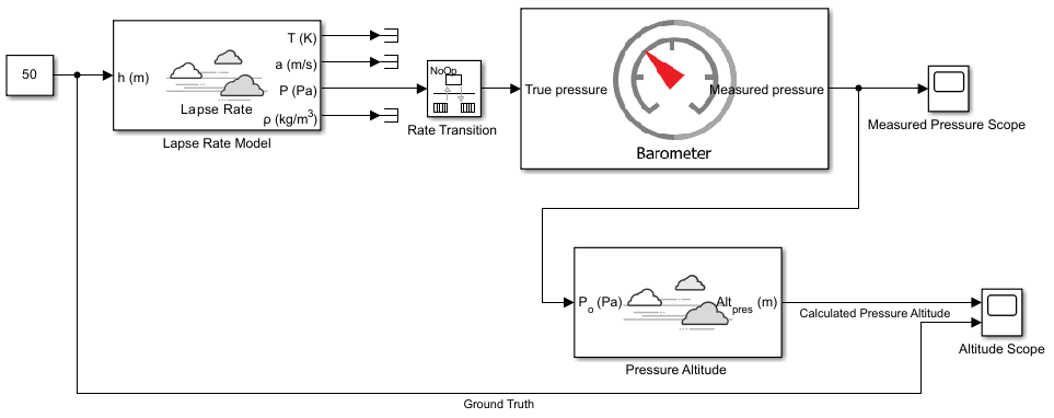 1. Lapse Rate Model (Aerospace Blockset) — Simulates lapse rate atmospheric model. The block receives altitude in meter, and outputs the atmospheric air pressure in Pascal, which is then measured by the barometer sensor. In this model, the input altitude is 50 meter.