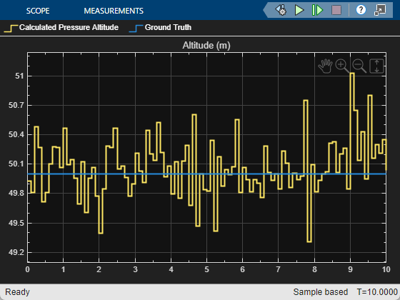 The Barometer block models a barometer sensor that generates an air pressure reading with a measurement noise that consists of constant measurement bias, uncorrelated white noise, and correlated noise [1]. For more information on the noise model, see Noise Model.