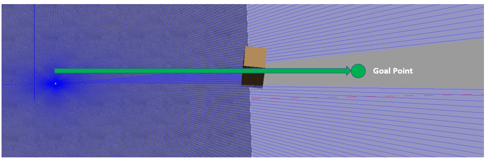 If obstacle avoidance is turned off, the UAV flies towards the goal point behind the obstacle box on a straight path, resulting in a collision. If obstacle avoidance is turned on, the UAV tries to fly above the obstacle based on the lidar sensor readings.