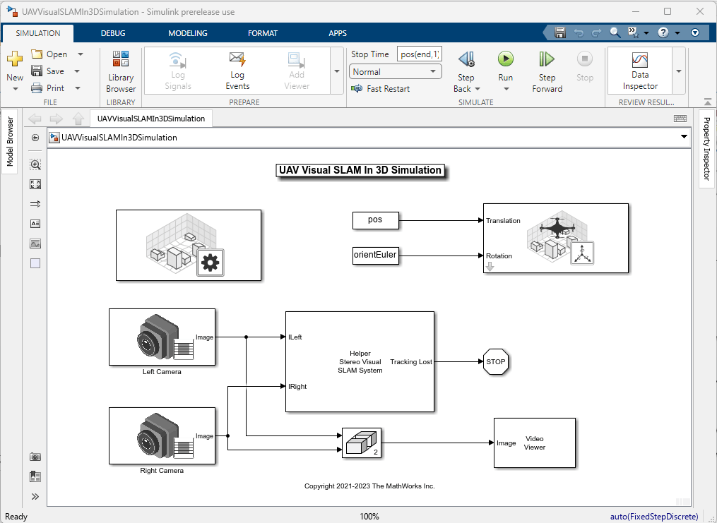 % Stereo camera parameters focalLength = [1109, 1109]; % In pixels principalPoint = [640, 360]; % In pixels [x, y] imageSize = [720, 1280]; % In pixels [mrows, ncols] baseline = 0.5; % In meters % Open the model modelName = 'UAVVisualSLAMIn3DSimulation'; open_system(modelName);