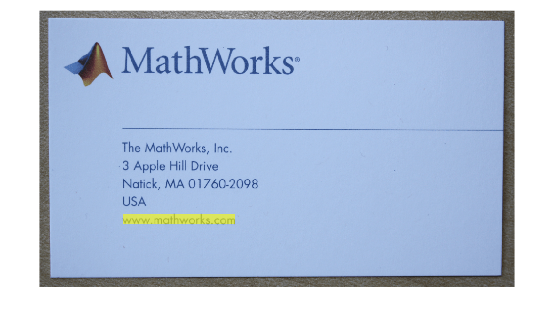 businessCard = imread("businessCard.png"); ocrResults = ocr(businessCard); bboxes = locateText(ocrResults, "www.*com","UseRegexp", true); img = insertShape(businessCard, "FilledRectangle", bboxes); figure imshow(img)