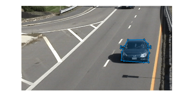 Draw a polygon ROI around the full visible car in this frame. Take care to not include the background road areas into your foreground polygon ROI for the car, as this can degrade the final results.