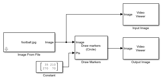 The model reads an input image using the Image From File block. The Constant (Simulink) block, which has a Constant value parameter of [35 210;270 70], specifies the pixel coordinates at which to draw two markers. The Draw Markers block then draws the markers on the input image. These markers are filled circles colored green and yellow, respectively. The Draw Markers block uses these nondefault parameters: