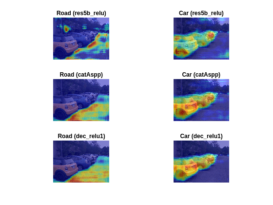 figure; idx = 1; for i=1:numLayers for j=1:numClasses subplot(numLayers,numClasses,idx) imshow(img) hold on imagesc(gradCAMMaps(:,:,j,i),AlphaData=0.5) title(sprintf("%s (%s)",classes(classNames(j)),layers(i)), ... Interpreter="none") colormap jet idx = idx + 1; end end