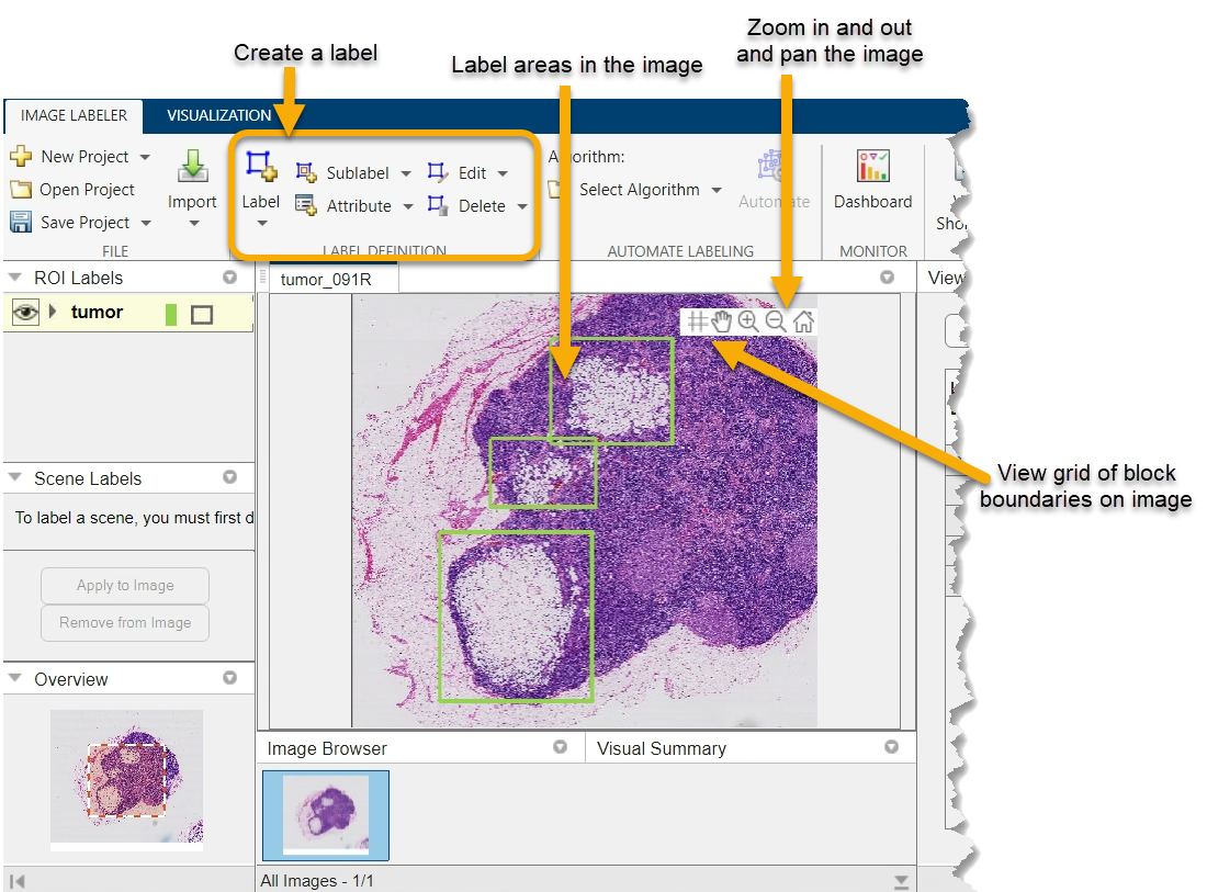 With blocked images, as with nonblocked images, you can take advantage of automated processing to help with the labeling process. For example, with medical images, you can do automatic detection using blocked image automation. You can train an object detector deep learning network and use that in the app to automatically label areas with bounding boxes.