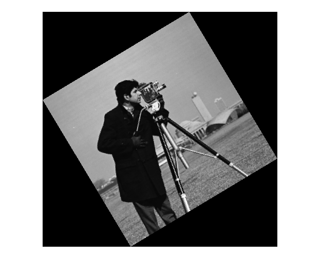 scale = 1.3; J = imresize(original,scale); theta = 31; distorted = imrotate(J,theta); figure imshow(distorted)