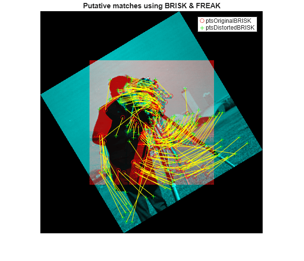 figure showMatchedFeatures(original,distorted,matchedOriginalBRISK,... matchedDistortedBRISK) title('Putative matches using BRISK & FREAK') legend('ptsOriginalBRISK','ptsDistortedBRISK')