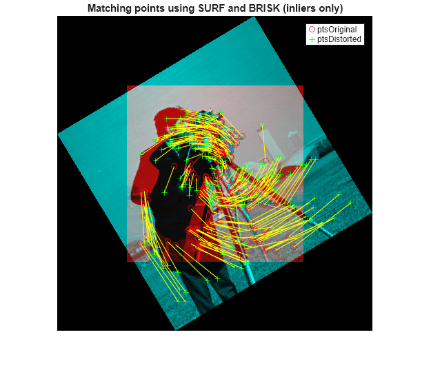 figure showMatchedFeatures(original,distorted,inlierOriginalXY,inlierDistortedXY) title('Matching points using SURF and BRISK (inliers only)') legend('ptsOriginal','ptsDistorted')