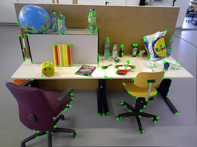 % Run full bundle adjustment on the first two key frames tracks = findTracks(vSetKeyFrames); cameraPoses = poses(vSetKeyFrames); [refinedPoints, refinedAbsPoses] = bundleAdjustment(xyzWorldPoints, tracks, ... cameraPoses, intrinsics, FixedViewIDs=1, ... PointsUndistorted=true, AbsoluteTolerance=1e-7,... RelativeTolerance=1e-15, MaxIteration=20, ... Solver="preconditioned-conjugate-gradient"); % Scale the map and the camera pose using the median depth of map points medianDepth = median(vecnorm(refinedPoints.')); refinedPoints = refinedPoints / medianDepth; refinedAbsPoses.AbsolutePose(currViewId).Translation = ... refinedAbsPoses.AbsolutePose(currViewId).Translation / medianDepth; relPose.Translation = relPose.Translation/medianDepth; % Update key frames with the refined poses vSetKeyFrames = updateView(vSetKeyFrames, refinedAbsPoses); vSetKeyFrames = updateConnection(vSetKeyFrames, preViewId, currViewId, relPose); % Update map points with the refined positions mapPointSet = updateWorldPoints(mapPointSet, newPointIdx, refinedPoints); % Update view direction and depth mapPointSet = updateLimitsAndDirection(mapPointSet, newPointIdx, vSetKeyFrames.Views); % Update representative view mapPointSet = updateRepresentativeView(mapPointSet, newPointIdx, vSetKeyFrames.Views); % Visualize matched features in the current frame close(hfeature.Parent.Parent); featurePlot = helperVisualizeMatchedFeatures(currI, currPoints(indexPairs(:,2)));