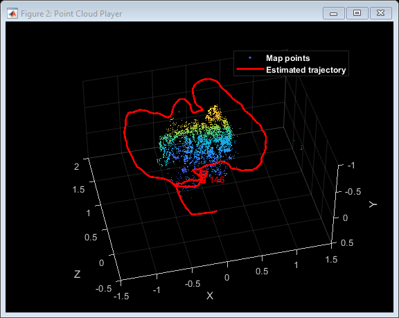 % Visualize initial map points and camera trajectory mapPlot = helperVisualizeMotionAndStructure(vSetKeyFrames, mapPointSet); % Show legend showLegend(mapPlot);