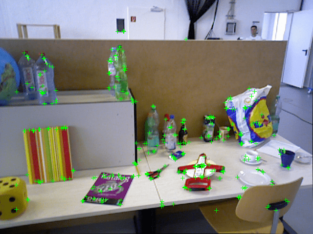 % Main loop isLastFrameKeyFrame = true; % Create and initialize the KLT tracker tracker = vision.PointTracker(MaxBidirectionalError = 5); initialize(tracker, currPoints.Location(indexPairs(:,2), :), currI); while currFrameIdx < numel(imds.Files) currI = readimage(imds, currFrameIdx); [currFeatures, currPoints] = helperDetectAndExtractFeatures(currI, scaleFactor, numLevels, numPoints); % Track the last key frame [currPose, mapPointsIdx, featureIdx] = helperTrackLastKeyFrameKLT(tracker, currI, mapPointSet, ... vSetKeyFrames.Views, currFeatures, currPoints, lastKeyFrameId, intrinsics); % Track the local map and check if the current frame is a key frame. % A frame is a key frame if both of the following conditions are satisfied: % % 1. At least 20 frames have passed since the last key frame or the % current frame tracks fewer than 100 map points. % 2. The map points tracked by the current frame are fewer than 90% of % points tracked by the reference key frame. % % Tracking performance is sensitive to the value of numPointsKeyFrame. % If tracking is lost, try a larger value. % % localKeyFrameIds: ViewId of the connected key frames of the current frame numSkipFrames = 20; numPointsKeyFrame = 90; [localKeyFrameIds, currPose, mapPointsIdx, featureIdx, isKeyFrame] = ... helperTrackLocalMap(mapPointSet, vSetKeyFrames, mapPointsIdx, ... featureIdx, currPose, currFeatures, currPoints, intrinsics, scaleFactor, ... isLastFrameKeyFrame, lastKeyFrameIdx, currFrameIdx, numSkipFrames, numPointsKeyFrame); % Visualize matched features updatePlot(featurePlot, currI, currPoints(featureIdx)); if ~isKeyFrame currFrameIdx = currFrameIdx + 1; isLastFrameKeyFrame = false; continue else currKeyFrameId = currKeyFrameId + 1; isLastFrameKeyFrame = true; end