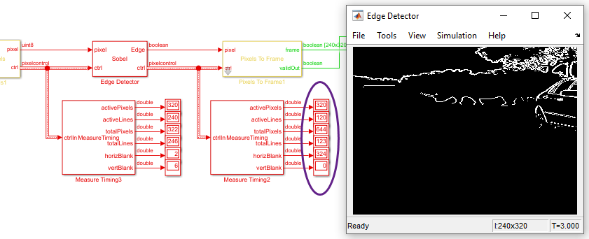 One way to diagnose blanking interval problems in Simulink is to use the Measure Timing block to observe the dimensions of the pixel stream before and after your operation. Inadequate blanking intervals cause the block to corrupt the control signals. In these cases, the output frames show different dimensions than the input frames.