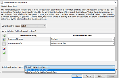 The Image Buffer subsystem contains two options for modeling the connection to external memory. It is a variant subsystem where you can select between the BehavioralMemory subsystem and the Video Frame Buffer block.