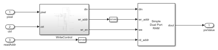 The WriteControl subsystem forms vectors of incoming pixels, write enables, and write addresses. The AddressGeneration subsystem provides a vector of read addresses. The vector of pixels from the RAM is the input to the BilinearInterpolation subsystem.
