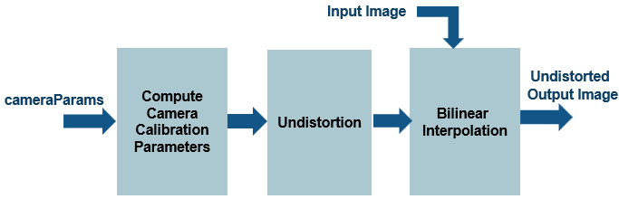 As inputs to the undistort algorithm, you specify the intrinsic matrix and distortion coefficients that describe the image distortion to be corrected. The intrinsic matrix comprises the focal length, the optical center (also known as the principal point), and the skew coefficient. The distortion coefficients model radial and tangential distortions mathematically.