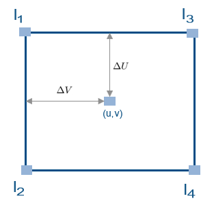 Bilinear Interpolation: The warping algorithm can produce coordinates (x,y) with noninteger values. To generate the pixel intensity values at each integer position, a warp algorithm can use various resampling techniques. The example uses bilinear interpolation. Interpolation resamples the image intensity values corresponding to the generated coordinates.