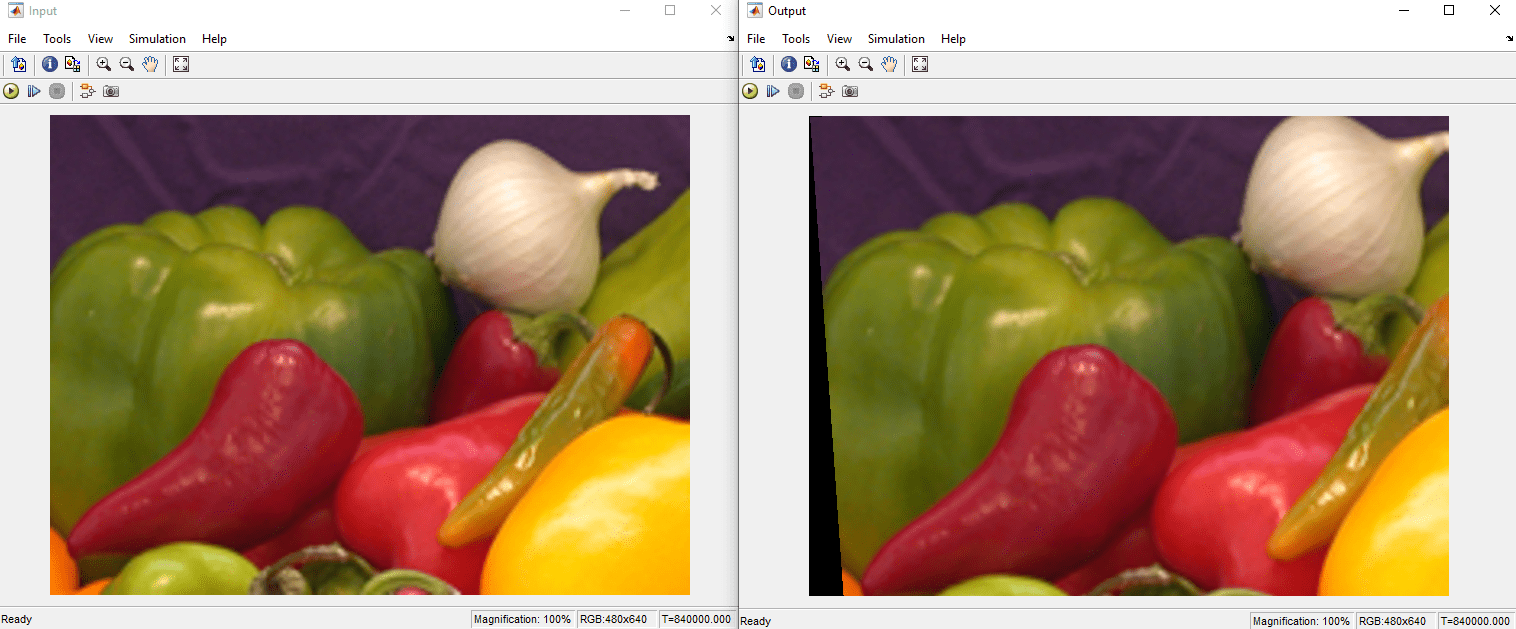 This figure shows the input image and the corresponding output image rotated by an angle of four degrees, scaled by a factor of 1.1, and translated by 0.4 and 0.8 in the x- and y-directions, respectively. The results of the ImageWarpHDL model match the output of the imwarp function in MATLAB.