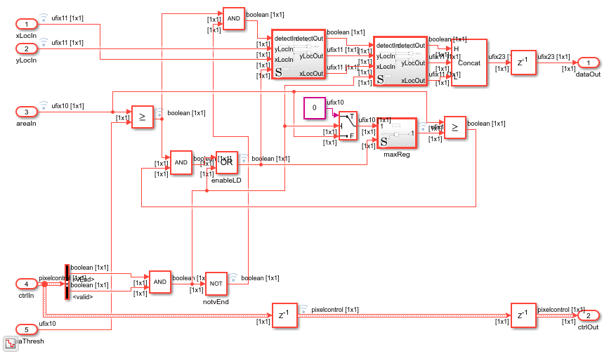 The Vision HDL Toolbox blocks force the output data to zero when the output is not valid, as indicated in the pixelcontrol bus output. While not strictly required, this behavior makes testing and debugging much easier. To accomplish this behavior for the centroid results, the model uses Switch blocks with a Constant block set to 0.