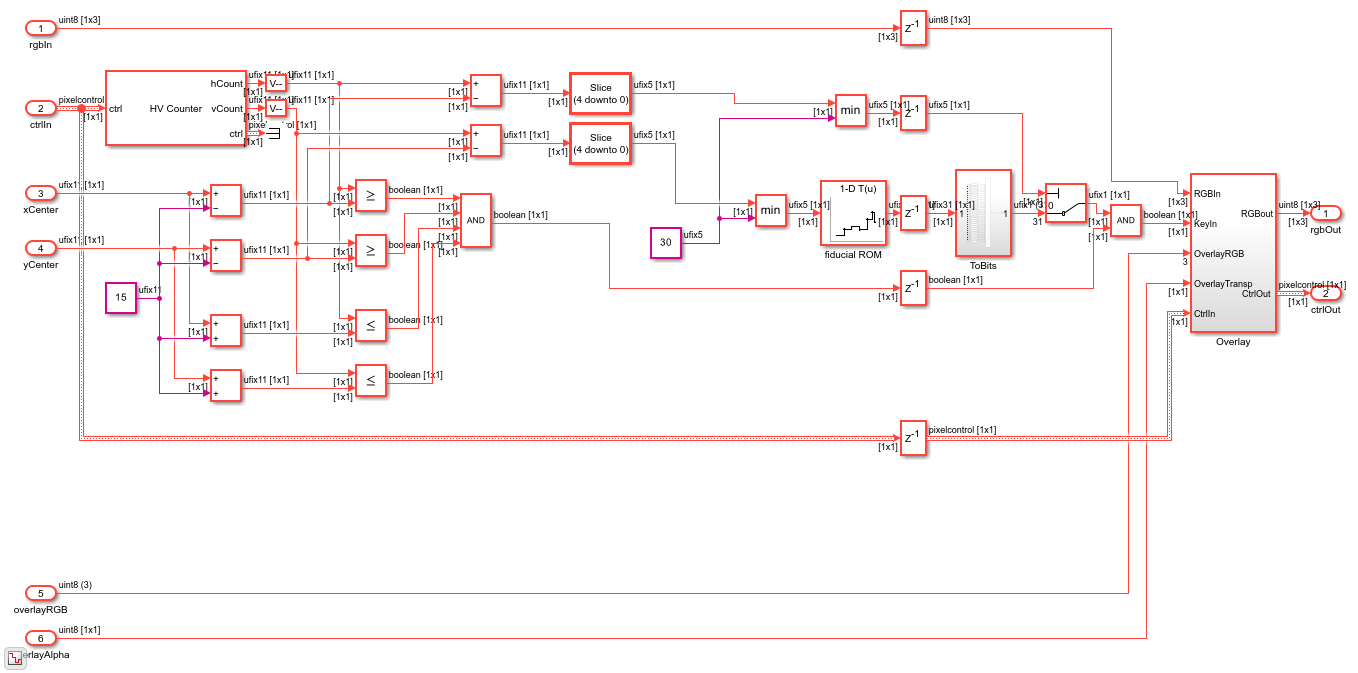 The fiducial overlay subsystem has a horizontal and vertical counter with a set of four comparators that uses the center of the detected area as the center of the region for the marker. The marker data is used as a binary switch that turns on alpha channel overlay. The alpha value is a fixed transparency parameter applied as a gain on the binary Detect signal when it is unpacked, in the ExpandData subsystem.