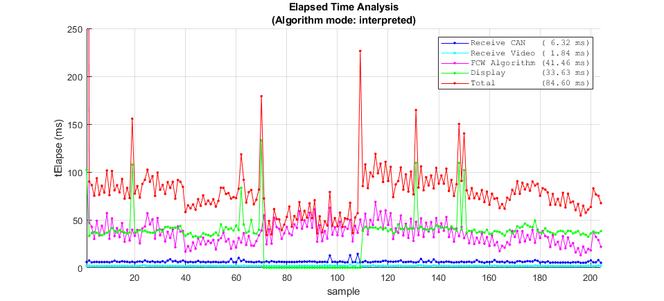 When ready, stop and close the transmitter and receiving FCW application. Comparing the time plot for MEX execution to the interpreted mode plot, you can see the performance improvement for the FCW algorithm.