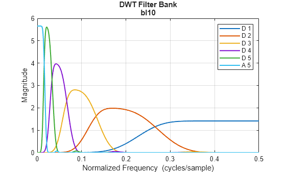 Figure contains an axes object. The axes object with title DWT Filter Bank bl10, xlabel Normalized Frequency (cycles/sample), ylabel Magnitude contains 6 objects of type line. These objects represent D 1, D 2, D 3, D 4, D 5, A 5.