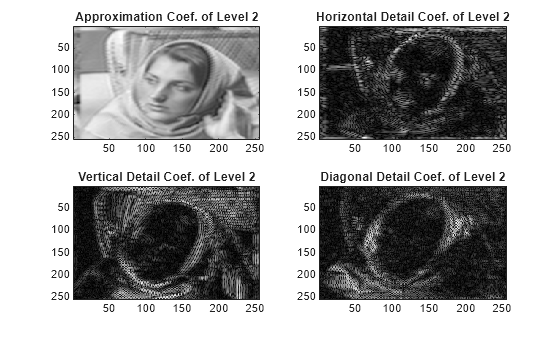 subplot(2,2,1) imagesc(A2) title('Approximation Coef. of Level 2') subplot(2,2,2) imagesc(H2) title('Horizontal Detail Coef. of Level 2') subplot(2,2,3) imagesc(V2) title('Vertical Detail Coef. of Level 2') subplot(2,2,4) imagesc(D2) title('Diagonal Detail Coef. of Level 2')