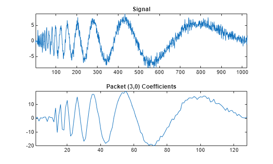 Figure contains 2 axes objects. Axes object 1 with title Signal contains an object of type line. Axes object 2 with title Packet (3,0) Coefficients contains an object of type line.