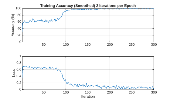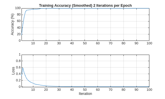 iterPerEpoch = floor(length(XTrainSCAT)/miniBatchSize); figure tiledlayout(2,1) nexttile smoothedACC = filter(1/iterPerEpoch*ones(iterPerEpoch,1),1, ... infoCONV.TrainingHistory.Accuracy); smoothedLoss = filter(1/iterPerEpoch*ones(iterPerEpoch,1),1, ... infoCONV.TrainingHistory.Loss); plot(smoothedACC) title("Training Accuracy (Smoothed) "+ ... num2str(iterPerEpoch)+" Iterations per Epoch") ylabel("Accuracy (%)") ylim([0 100.1]) grid on xlim([1 length(smoothedACC)]) nexttile plot(smoothedLoss) ylim([-0.01 1]) grid on xlim([1 length(smoothedLoss)]) ylabel("Loss") xlabel("Iteration")