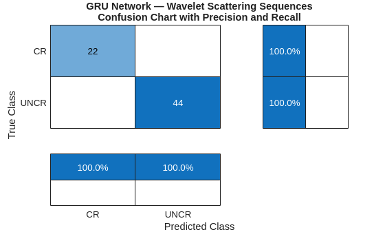 miniBatchSize = 15; scores = minibatchpredict(scatGRUnet,XTestSCAT, ... MiniBatchSize=miniBatchSize, ... InputDataFormats="CTB"); ypredSCAT = scores2label(scores,classNames); figure confusionchart(TestLabels,ypredSCAT,RowSummary="row-normalized", ... ColumnSummary="column-normalized") title({"GRU Network — Wavelet Scattering Sequences"; ... "Confusion Chart with Precision and Recall"})