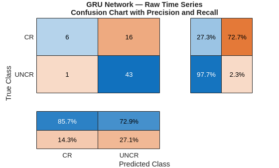 load(fullfile(saveFolder,"transverse_crack_latest","tsGRUnet.mat")) tsGRUnet = dag2dlnetwork(tsGRUnet); rawTest = cellfun(@transpose,TestData,UniformOutput=false); miniBatchSize = 15; scores = minibatchpredict(tsGRUnet,rawTest, ... MiniBatchSize=miniBatchSize, ... InputDataFormats="CTB"); YPredraw = scores2label(scores,classNames); confusionchart(TestLabels,YPredraw,RowSummary="row-normalized", ... ColumnSummary="column-normalized") title({"GRU Network — Raw Time Series"; ... "Confusion Chart with Precision and Recall"})