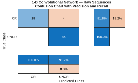 load(fullfile(saveFolder,"transverse_crack_latest","tsCONV1Dnet.mat")) tsCONV1Dnet = dag2dlnetwork(tsCONV1Dnet); miniBatchSize = 15; TestDataT = cellfun(@transpose,TestData,UniformOutput=false); socres = minibatchpredict(tsCONV1Dnet,TestDataT, ... MiniBatchSize=miniBatchSize, ... InputDataFormats="CTB"); YPredRAW = scores2label(socres,classNames); confusionchart(TestLabels,YPredRAW,RowSummary="row-normalized", ... ColumnSummary="column-normalized") title({"1-D Convolutional Network — Raw Sequences"; ... "Confusion Chart with Precision and Recall"})