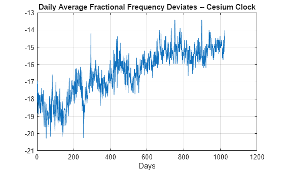 load clock_571 plot(clock_571) xlabel('Days') grid on title('Daily Average Fractional Frequency Deviates -- Cesium Clock')